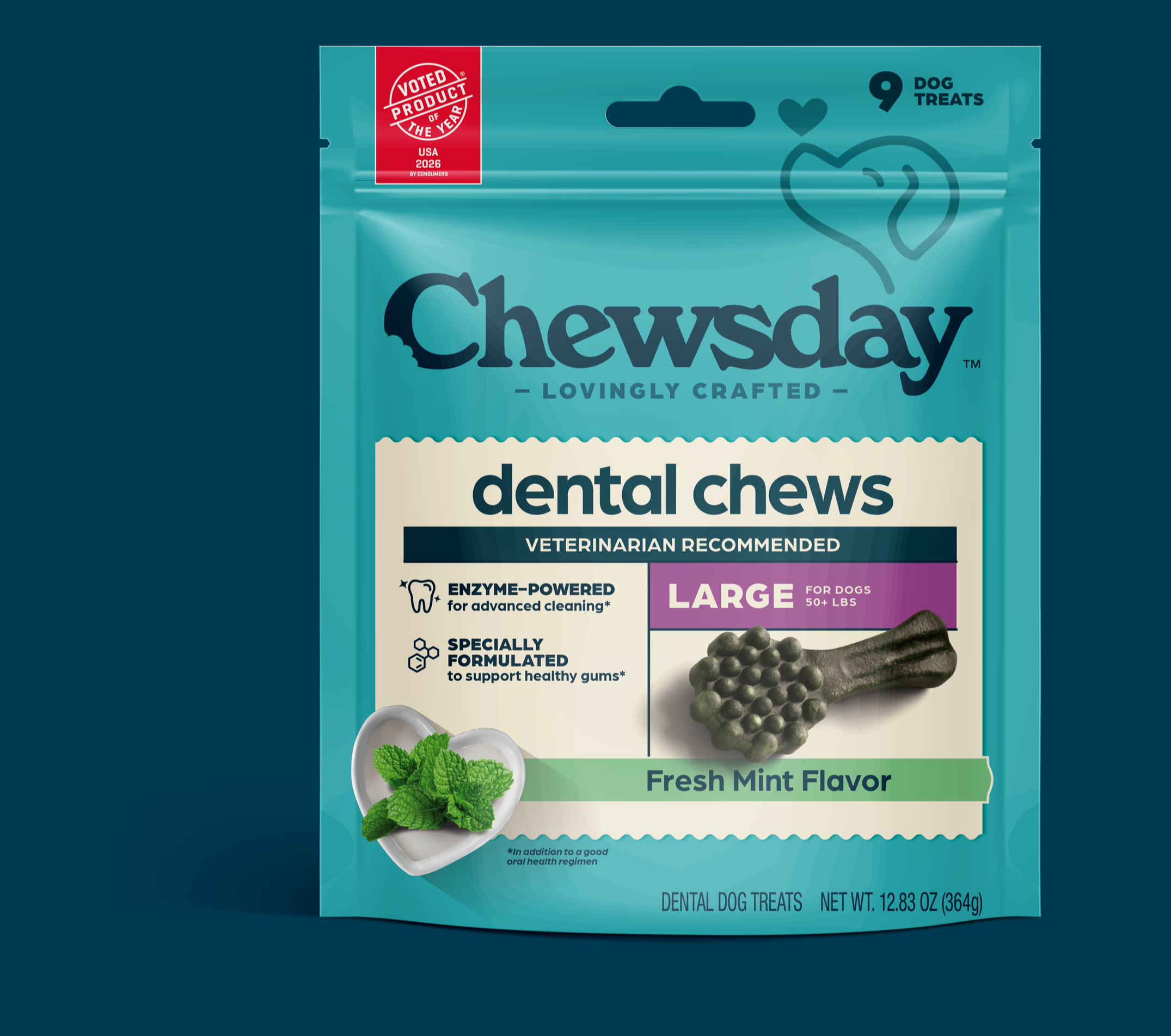 Chewsday’s veterinarian recommended dental chews clean differently. Using the natural power of enzymes for advanced cleaning and naturally fresh breath, we’re here to help you and your dog rethink the chew.